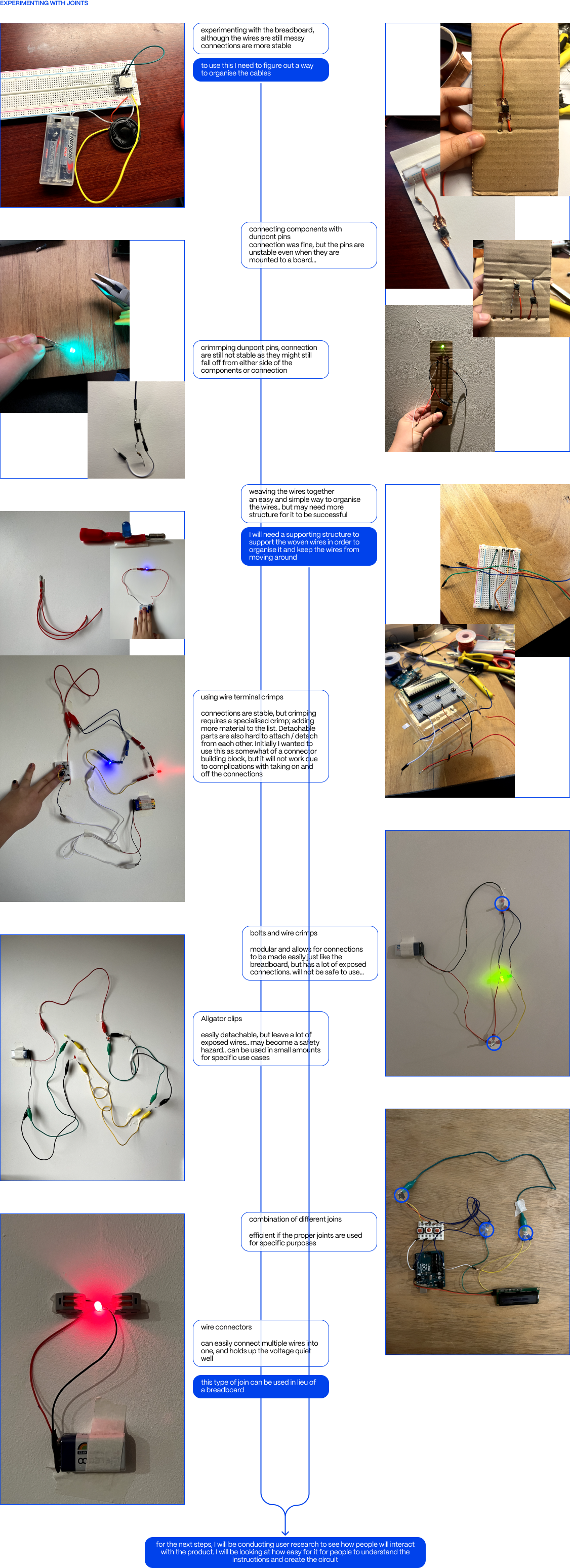 Often, electronics can look intimidating, especially for older people since the parts are very tiny and hard to see. In this document, I explore different ways to address these two problems by experimenting with different joints such as crimps, clips, and weaving.